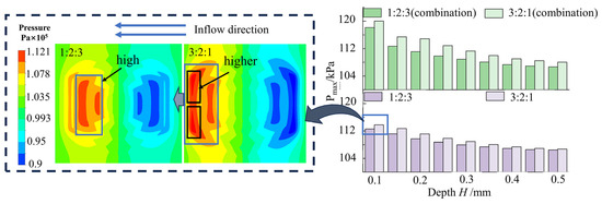 Figure 8 shows the maximum pressure of a multilayer hexagonal groove texture with different width gradients with increasing groove depth. The three-layer groove widths were represented as 1:2:3 and 3:2:1, respectively. The maximum pressure on the upper surface of the oil film for the multilayer hexagonal groove weave with a width gradient of 1:2:3 from outer to inner was lower compared with a width gradient of 3:2:1. Both sets of width gradient groove weaves exhibited similar pressure characteristics to the conventional multilayer hexagonal groove weave. As the depth of the grooves increased from 0.1 mm to 0.5 mm, the pressure gradually decreased and then plateaued.