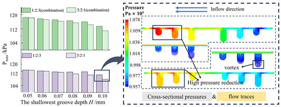The pressure maps at the cross-sections of the grooves elucidated the above phenomenon. The pressure map of the groove cross-section, combined with the description of the pressure map at the cross-section of the multilayer hexagonal texture by the depth of the grooves in Section 3.1 above, indicated that the outer two grooves primarily bear pressure in the multilayer hexagonal texture with three turns of grooves. In the 1:2:3 groove depth arrangement, the pressure was greater in the outermost and middle groove sections, with minimal energy loss in the deepest grooves in the absence of vortices. Conversely, in the 3:2:1 groove depth gradient arrangement, the outermost grooves were affected by the energy loss due to the formation and development of vortices. Thus, it was difficult for hydrodynamic effects to counteract the energy loss from the vortices, resulting in lower maximal pressure on the oil film.