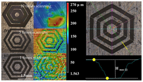 As shown in Figure 3d, H is the depth of the groove designed in the simulation, h is the depth of the pit designed in the simulation, and Hmax is the maximum depth of the laser-machined grooves.