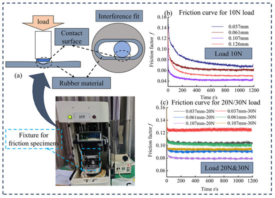 The experiment was conducted under actual well conditions, employing liquid lubrication in an oilfield with shale oil. This setup simulated the working environment of a downhole screw pump for tribological experiments. Applying different loads to better simulate the friction characteristics of rubber after pressure deformation during downhole screw pump stator-rotor interference fit (Figure 11a). The friction coefficient of the rubber specimen exhibited a decreasing trend during the first 200 s of the friction experiment due to the high initial pressure. Subsequently, it gradually reached a plateau after 200 s. The friction factor value after the stabilization of the friction curve served as the standard for evaluating the tribological performance of different textures.