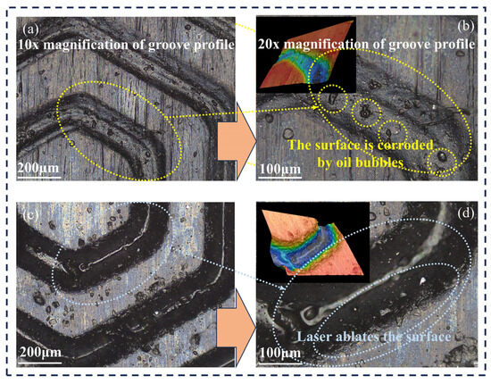 (a–d) Microscopic image of laser-machined rubber surface after oil immersion(10× & 20×).