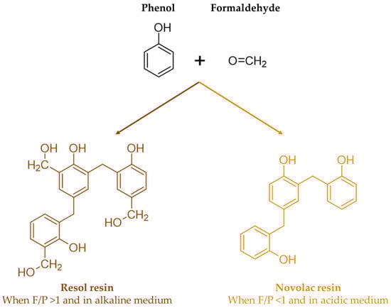 When a base catalyst combined with an excess of formaldehyde-to-phenol ratio is used, a resol resin is obtained. On the other hand, when less than an equimolar amount of formaldehyde is used under acidic conditions, a novolac resin is produced. These reactions are shown in Figure 2 [7].