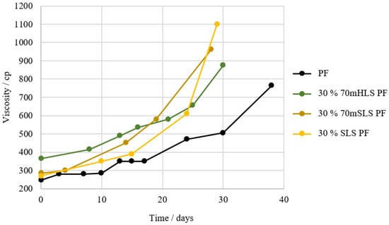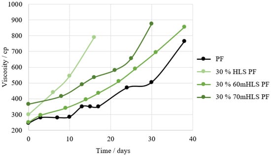 Once again, it is verified that the incorporation of LS in the PF resin results in an increase in viscosity. However, as shown in Figure 7, it appears that resins manufactured with SLS instead of HLS suffer a significantly faster increase in viscosity over time. This indicates that the synthesis of this resin still needs further optimization, namely through the reduction of the lignin-to-formaldehyde ratio, as SLS consumes less formaldehyde [54].