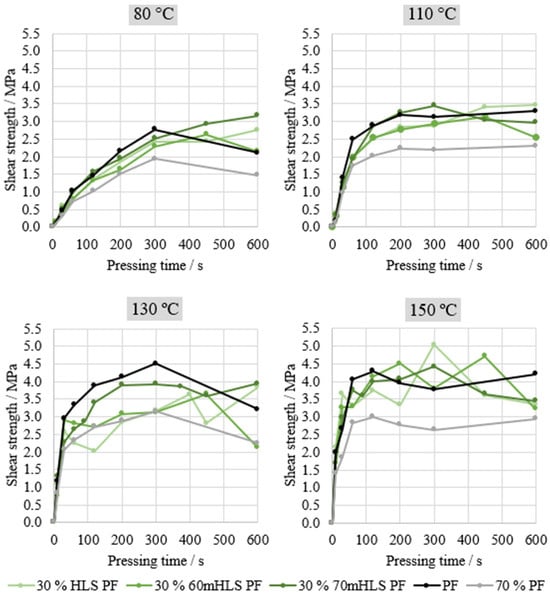 Lastly, the performance of the manufactured resins was evaluated through ABES. Thus, the shear strength under tensile load of two veneer strips bound together by the manufactured resins was assessed. Four different pressing temperatures were assessed: 80, 110, 130, and 150 °C. This analysis was carried in order to select the most promising resins for plywood production, using the results of the commercial PF resin as reference, as shown in Figure 6. An additional curve is also shown—70% PF—simply computed to represent 70% of the commercial PF resin’s performance, in order to assess whether HLS are acting merely as an inert filler or actively contributing towards bonding performance.