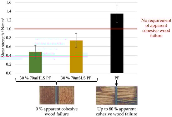 These resins were then used to produce plywood whose performance was assessed as previously. The results of the bonding quality of the boards according to EN 314-2, class 3—exterior conditions, are shown in Figure 15.