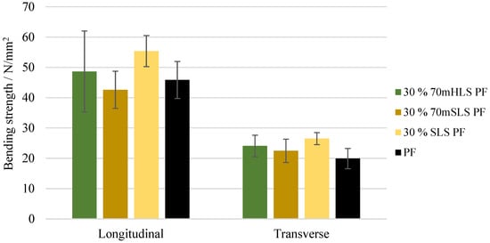 The bending strength and modulus of elasticity of these boards are shown in Figure 16 and Figure 17, respectively. As concluded previously, the LPF boards display a similar performance to those manufactured with the commercial PF resin. There appeared to be a slight increase in both the modulus of rupture and elasticity as the SLS content increases. However, this was only considered to be significantly different for the modulus of elasticity in the transverse direction ().