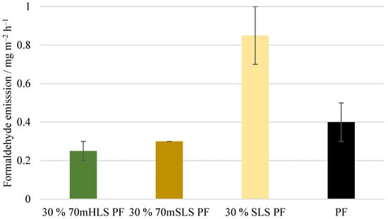 Lastly, the formaldehyde emission (gas analysis value) of these boards was determined. As shown in Figure 18, no significant differences () were observed between the emissions of the SLS boards and that of the boards manufactured with the commercial PF resin.