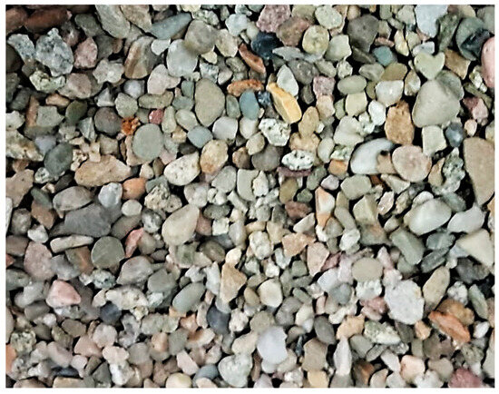 Two series of normal-weight structural concretes were prepared for the tests. Exactly as in the case of the lightweight concrete series described in [14], both normal-weight concrete series maintained comparable volumes of coarse aggregate (ca 45%) and mortar–cement matrix (ca 55%). Since two different water–cement ratios (w/c), 0.37 and 0.55, were used, these two composites reached various levels of mechanical properties. Additionally, to provide a constant consistency for both concrete mixtures, a superplasticizing admixture was dosed to the fresh concrete with the lower water–cement ratio. The following constituent materials were used for both concrete series: tap water, cement CEM I 42.5 R, 0/2 mm natural sand, and 4/16 mm natural gravel. The coarse aggregate consisted of a blend of single-crushed rounded aggregates with predominantly sandstone grains (Figure 1).