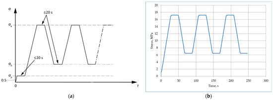 The range of stress for Ec,s determination was established on the basis of mean compressive strength (fcm, cyl). According to Method B included in EN 12390-13 [7], the lower stress σb was set to a value 0.13 fcm, cyl from the standard range (0.10–0.20) fcm, cyl, while the upper-stress σa was set to 1/3 fcm, cyl. The stress ranges in which both series of concretes were tested, determined on the basis of compressive strength tests, were given in Section 3.2.1. Figure 3 shows loading cycles according to the standard and exemplary cycles recorded during a test of a certain specimen.