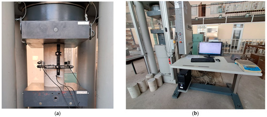 Testing equipment used for measurements of static secant modulus of elasticity: (a) a concrete cylinder under compression; (b) automatically controlled compressive testing machine.