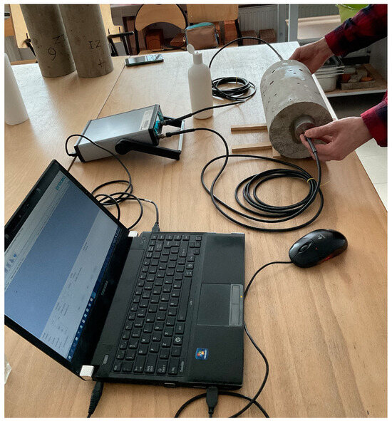 EN 12504-4 [24] indicates that ultrasonic velocity may decrease with longer path lengths due to concrete heterogeneity. Therefore, the probes were positioned on both bases of concrete cylinders along their length, which was the least favorable position with the path length of ca 300 mm. Approximately 30 pulse velocity measurements were taken at each probe position to calculate the average value.