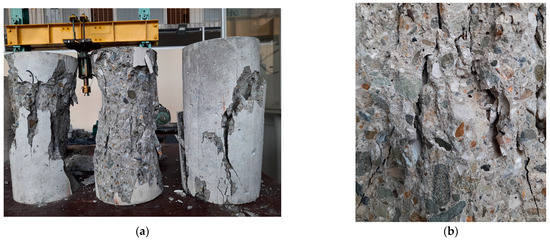 Figure 6 demonstrates fracture patterns which were observed after the tests of cylinders of both concrete series after their compression failure. The failure form of cylindrical specimens, visible in Figure 6a, corresponds to the correct forms in accordance with EN 206. Both concretes revealed homogenous structures and a lack of segregation. Furthermore, in spite of coarse aggregate primarily consisting of rounded grains, the tested concretes exhibited relatively good bonds between aggregate and mortar (see Figure 6b). For this reason, cracks propagated both through the bond, as well as through the aggregate grains themselves.