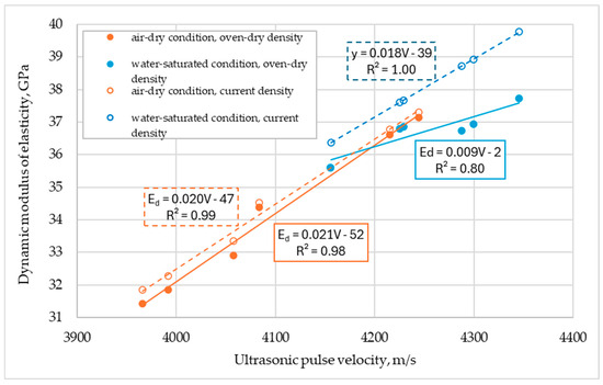 Figure 7 illustrates some relationships for the measured ultrasonic pulse velocities and estimated dynamic moduli. In the figure, besides the estimations of the dynamic modulus considering the concrete density under the dry condition (marked with a solid line), additional dependencies are presented, taking into account the current concrete density in the state in which it was tested (dashed line). As can be seen from the comparison, consideration of the moisture content of composites in different conditions significantly affects the estimated Ed value. In particular, differences are noticeable when testing specimens saturated in water. However, regardless of the type of density considered in the calculations (oven-dry or current), similarly to the relationships observed for sibling lightweight concretes discussed in [14], it is evident that these relationships are influenced by both the type of concrete and the moisture condition. The impact of the moisture condition appears to be more pronounced. However, this factor is not explicitly included in Equation (3).