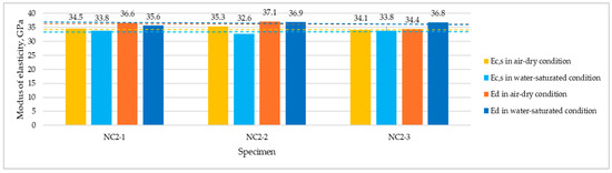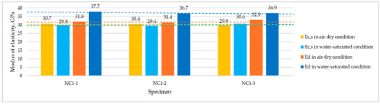 Table 7 presents the results of dynamic moduli estimations calculated on the basis of Equation (2). The calculations used the oven-dry density as a parameter characterizing the structure of the material. For dried cylinders, the average dynamic moduli were 32.1 GPa for NC1 and 36.0 GPa for NC2. Meanwhile, the tests carried out on wet cylinders indicated the following results: 37.1 GPa for NC1 and 36.4 GPa for NC2. The moduli standard deviations were in the range of 0.4–1.2 GPa.