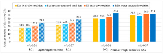 In Figure 10, average moduli test results obtained for structural normal-weight concretes are presented alongside results reported in [14] for structural lightweight concretes with the same volume composition and differing only in the type of coarse aggregate used. From the comparative analysis of modulus values obtained for both types of concretes, it is evident that while the coarse aggregate type has a crucial impact on the static secant modulus, its effect on the dependence of modulus values on concrete moisture is marginal. Owing to the high water absorption of lightweight aggregate used in [14], the water absorption of concretes made with this aggregate was considerably higher (10.1% and 7.9%) than that of corresponding normal-weight concretes (5.4% and 2.2%). Despite the different moisture content of saturated concretes of both types, no significant influence of moisture on Ec,s values was observed in any lightweight or normal-weight concrete. However, during dynamic modulus testing, water contained in both cement paste and aggregate pores contributes to the increase in ultrasonic pulse velocity. As a result, the lightweight concretes discussed in [14] showed an even greater influence of water saturation on the increase in dynamic modulus values compared to the tested normal-weight concretes.