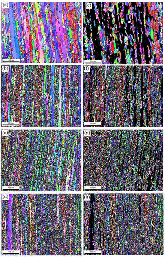 - By analyzing the DSC curves and activation energies of the alloys under different pre-deformation conditions, it was found that the activation energies of the phases are lower under higher-pre-deformation conditions, so the introduction of pre-deformation accelerates the precipitation of the second phase in the alloys. The lower activation energy of precipitation increases the nucleation sites, which further promotes the diffuse distribution of the second phase in the alloy. At the same time, the higher number of nucleation sites limits the coarsening of the precipitated phase.