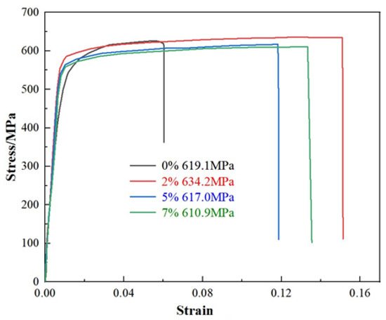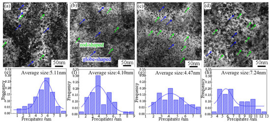 - Pre-stretching can promote the precipitation of the precipitated phase during the aging process, increase the volume fraction of the precipitated phase, and achieve precipitation strengthening of the alloy. As the amount of pre-deformation increases (less than 5%), the volume fraction of the second phase increases, and the strengthening effect of the precipitated phase on the alloy increases. However, when the pre-deformation amount is 7%, although the volume fraction of the precipitated phase increases, the precipitated phase is coarsened, which reduces the strengthening effect on the alloy and adversely affects its mechanical properties. The contribution of dislocation strengthening to the strength of the alloys in different deformation heat-treated states, on the other hand, increases with the increase in the amount of pre-deformation. These dislocations not only provide channels for the precipitation of solute atoms but also increase the strength of the alloy when the amount of deformation is increased. To a certain extent, the dislocations inside the alloy are entangled and piled up with each other and impede the dislocation slip.