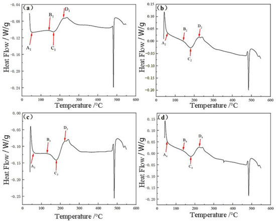 | Phases | Peak Temperature/°C | Q (Hot Activation Energy)/(kJ·mol−1) | k0 (Constant)/s−1 |