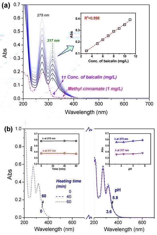 (a) UV–Vis spectra and calibration curve of baicalin in water solution, and (b) stability of baicalin under various heating periods and pH values. Note: The square, circle and triangle in the subfigure represent the Abs of corresponding spectrum at each maximum absorption wavelength.