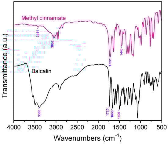 The FTIR spectra of methyl cinnamate and baicalin are depicted in Figure 2. The featured peaks of baicalin are present at 3388 cm−1 (OH stretching), 1725 and 1660 cm−1 (C=O stretching), and 1496 cm−1 (C=C stretching). The angular deformation of C=CH of the aromatic compounds appears between 650 and 1000 cm−1. The characteristic peaks of methyl cinnamate are 3411 cm−1 for O-H stretching, 3062 cm−1 for C-H aromatic stretching, 1722 cm−1 for C=O stretching, and 1446 cm−1 for C=C aromatic stretching.