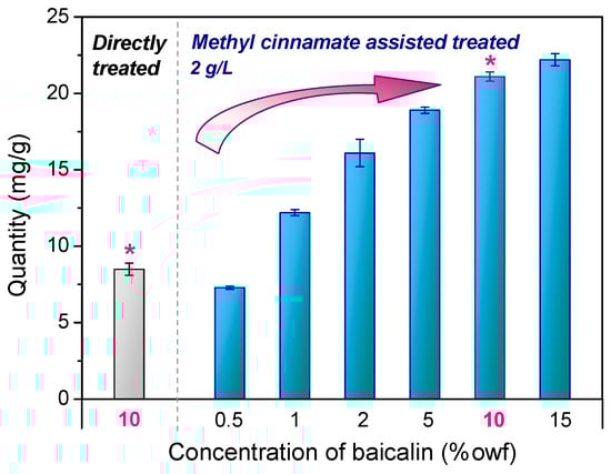 To explore the influence of methyl cinnamate on the adsorption of baicalin onto PLA, two methods were employed: direct baicalin treatment and methyl-cinnamate-assisted baicalin treatment. As depicted in Figure 3, the asterisks indicate two samples using the same concentration (10% owf) of baicalin with and without ester for easy comparison. Only 8.5 mg/g of baicalin (with an initial concentration of 10% owf) adhered to the PLA devoid of esters. In stark contrast, the presence of methyl cinnamate facilitated the attachment of 21.1 mg/g of baicalin, marking a significant increase of 2.5 times. This augmentation is attributed to the ‘molecular lubricant’ role of esters, which, upon heating, distend the space amid polymer chains, boosting baicalin’s mobility within the amorphous regions of the PLA fibers. The enhanced solubility of baicalin in the company of esters also plays a part, dissolving the baicalein aggregates into individual molecules, facilitating adsorption. Furthermore, the quantity of baicalin absorbed onto PLA can be regulated by varying the concentration of baicalein, catering to diverse application requirements when methyl cinnamate is present.