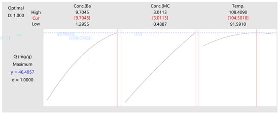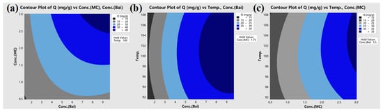 Plots for main effects and interactions facilitate the comprehension of variable significance and their interplays [22]. Pareto diagrams serve to illustrate the magnitudes of effects. As depicted in Figure 4a’s Pareto chart and the main effect plot in Figure 4b, baicalin and MC concentrations emerge as prominent variables, followed by temperature, a finding that aligns with their respective p-values in Table 3. Notable interactions occur between Conc.(Bai)×Conc.(MC) and Conc.(MC)×Temp. The interaction between Conc.(Bai)×Conc.(MC) suggests that the presence of MC boosts baicalin’s solubility and mobility, thus augmenting the final adsorption amount. Elevated temperatures further augment fiber expansion in conjunction with MC. Conversely, there is minimal interaction between Conc.(Bai)×Temp. influencing the absorption quantity.