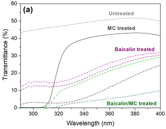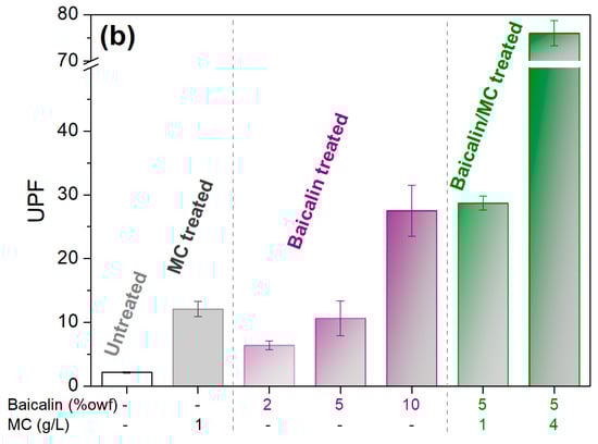 As illustrated in Figure 7, untreated PLA exhibits substantial transparency to both UVB (280 to 320 nm) and UVA (320 to 400 nm) wavelengths, leading to a low ultraviolet protection factor (UPF). This vulnerability to UV radiation can be attributed to PLA’s aliphatic configuration, which lacks adequate UV absorption properties. On the other hand, myricetin (MC) displays potent UVB absorbance capabilities (as evident from the UV–Vis absorption spectra in Figure 1a) due to its trans–cis isomerization under UV exposure [23], thereby escalating PLA’s UPF rating beyond 10. Baicalin, at a concentration of 10% owf, significantly impedes UV transmission through the PLA fabric, particularly in the UVA region, boosting the UPF to 27. The UVA absorption property of baicalin is primarily linked to its cinnamoyl moiety [24]. Nevertheless, baicalin alone demonstrates less efficacy in curbing UVB transmission than MC, a discrepancy echoed in their respective UV–Vis absorption spectra in Figure 1a. When combined, baicalin and MC jointly diminish UV transmission across both UVB and UVA bands, significantly amplifying the UPF. As per the AS/NZS 4399: 2017 standard [19], the PLA material treated with 5% owf baicalin and 4 g/L MC qualifies as a UPF 50+ product. This superior UV protection is largely owing to the high baicalin content of PLA in conjunction with MC’s residual presence on the material.