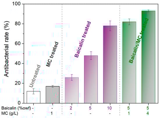 Textiles often undergo antibacterial treatments to avert disease transmission and minimize the risk of infection from injuries. These treatments also control odor formation from sweat, stains, and soil on fabrics, as well as hinder fabric degradation due to mold growth. As per previous research, baicalin is believed to hinder fungal growth possibly through disrupting the cellular wall and membrane integrity. As depicted in Figure 8, the untreated PLA fabric demonstrates weak antibacterial properties, demonstrating only a 16% inhibition rate against E. coli. Conversely, the baicalin-treated PLA fabrics display significant antibacterial efficacy against E. coli, albeit with an inhibition rate below 80%. A substantial improvement is evident when baicalin is combined with MC treatment. The PLA fabric treated with 5% owf of baicalin and 4 g/L of MC exhibits a 92% antibacterial rate, significantly outperforming the 10% owf baicalin-treated PLA.