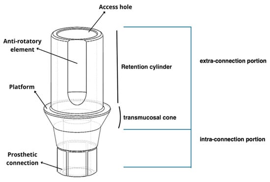 In order to avoid this type of complication, Ti bases were developed (Figure 1). These abutments are usually made of titanium grade 5 [4]. Their design consists of an intra-connection portion of the implant (thus mechanizing in this case two materials of similar elastic behavior), an extra connection with a conical transmucosal portion, which ends up on a seat platform on the crown retainer, and a coronal cylindrical portion, whose objective is the retention of the prosthesis via cementing. The result, therefore, is a complex abutment implant whose retention can be considered hybrid, i.e., cemented and screw-retained retention.