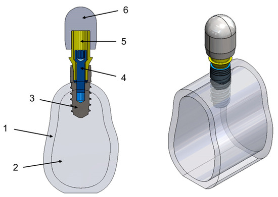 Three-dimensional design of the assembly of the dental implant system. Composed of cortical (1) and trabecular (2) bone, the dental implant (3), screw (4), Ti base (5), and hemispherical loading element (6). Own source.