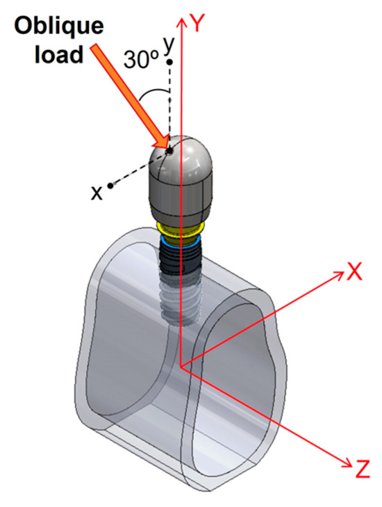The load simulated in the finite element analysis is schematized in Figure 3. A force of 360 N [20] was applied with an angulation of 30° with respect to the axial axis of the implant.