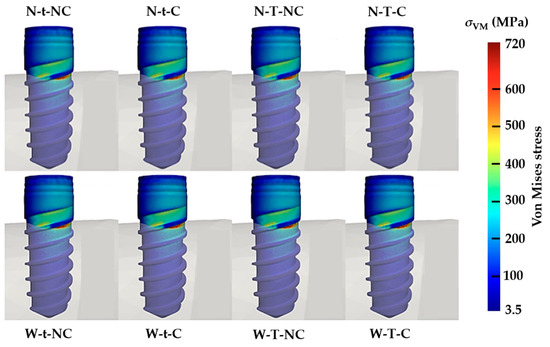 Considering the results around the implant, the first appreciable feature is that for all models, the stress distributions are practically identical, regardless of the Ti-base model analyzed. The stresses are concentrated in the area closest to the bone, also called the implant–bone intersection. This is a fact supported by the literature [6,21,22] and is already assumed to be normal behavior for the implant under non-axial loads. This behavior is due to what is known as the “Law of the Lever”, where a concentration of stress is produced at the first point of contact between the lever (in this case the implant) and the supporting point (in this case the cortical bone). In general, it is considered that this behavior is highly influenced by the different elastic properties of the materials in contact (titanium and bone). The same result can be observed in studies of the same methodology and similar design but in which the implant is placed at bone level [18]. In addition, a finite element analysis was carried out to determine the maximum load values on each model that could cause the implant to exceed its proportional limits in the resulting deformations. Although differences have been found between typologies, the average value is 364.5 N and the difference between the designs with the highest (W-t-NC) and lowest (W-T-C) values is only 16 N. This difference value constitutes only 4.38% of the mean value found, and although it is a low percentage value, it could have an influence on possible mechanical failures, especially when an unfavorable direction of force application is added to this magnitude.