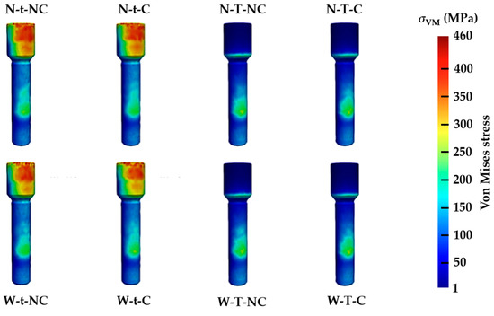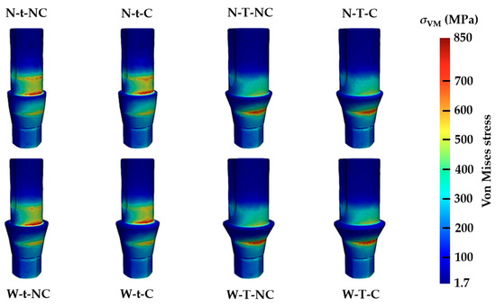 The maximum stress values of the eight different typologies according to von Mises at the level of the implant, retention screw, and Ti base are shown in Table 3. The first conclusion is that for all cases, the maximum values are always higher in the Ti base, then the implant, and finally the retention screw. The W-t-NC test model presents the highest tension at the level of the abutment and, at the same time, the lowest at the level of the implant. In fact, a relationship between the absence of chamfer (NC) and the appearance of higher levels of tension according to von Mises, at the level of the Ti base itself, can be described. However, it should be noted that the variable t (thickness) is clearly involved in the increase in the transfer of maximum stress, in this case at the level of the retention screw. These values are nearly double those of the four typologies of T thickness. This can have clinical repercussions if it is considered that the possibility of the fracture of a cylindrical element is intimately related to its radius.