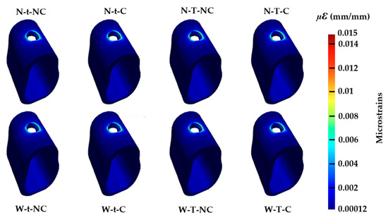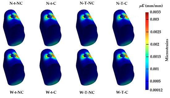 Again, the greatest strain received by the cortical bone was detected in the crestal area, i.e., in the first contact points between the bone and the implant (Figure 8). In the case of the trabecular bone, the largest strains were encountered at its margin, around the intersection with the implant (Figure 8). It should be noted that, as in the case of implants, it is not possible to describe the different types of resulting microdeformations for the eight types of Ti bases in this study.