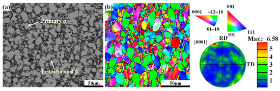 In this work, a TA15 near-α titanium alloy is used, which is made of Western Superconducting Materials Technology Co., LTD. in China. The main composition of the alloy is reported in Reference [4]. The α/β phase transition temperature of the alloy is around 998 °C. The initial microstructure and orientation features of the billet are shown in Figure 2. It can be seen that there is an obvious equiaxed microstructure in the initial billet. Among the features, the volume fraction of coarse primary α (αp) grains is around 52.95%, and the mean size of the grain is around 12.86 μm. In addition, there is a weak cluster zone of {0001} poles which mainly converges in the normal direction (ND).