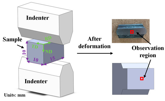 The plane strain compression experiments were carried out on a Gleeble-3500 thermal simulation testing machine (DSI Company, St. Paul, MN, USA). The dimensions of the specimen and indenter distribution are displayed in Figure 3. Here, considering the strain state of plane strain compression is similar to that of the rolling process, the coordinate system in the plane strain compression was set to that of rolling (Figure 3). During deformation, the specimen was first heated to a temperature of 800 °C at a rate of 10 °C/s and kept there for 5 min, and then compressed. The detailed compression conditions are presented in Table 1. After deformation, the specimen was cut perpendicularly to the rolling direction (RD). Then, the microscope features in transverse direction (TD)–normal direction (ND) plane were characterized. The microstructural specimens were prepared by grinding and electrolytic polishing. The electrolytic polishing was performed at a voltage of 30 V and temperature of 5 °C for 45 s in a solution of 5% HClO4 + 65% CH3OH + 30% C4H10O. Subsequently, an FE-SEM Merlin (Zeiss Gemini 300, Carl Zeiss AG, Oberkochen, GER) compact scanning electron microscope from Zeiss was used for Electron Back-Scattered Diffraction (EBSD, (Oxford NordlysNano, High Wycombe, UK)) testing, and the data were analyzed using HKL Channel 5 software.