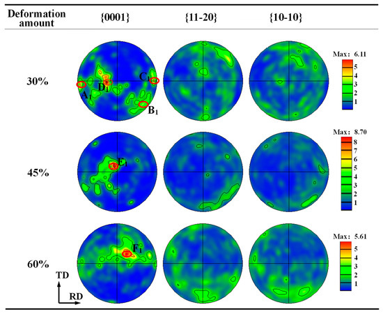 Figure 4 shows the pole figure (PF) of the α phase under different plane strain compression deformation amounts at a temperature of 850 °C and a strain rate of 0.01 s−1. It can be found that the {0001} poles of the α grains are mainly distributed near the ND, while the {10-10} and {11-20} poles are located on the RD-TD plane, exhibiting a distinct basal texture component regardless of deformation amount. When the deformation amount is 30%, the poles are distributed dispersively, and the {0001} poles are mainly clustered in zones A1, B1, C1 and D1, of which the intensity in zone D1 is the largest. When the deformation amount increases to 45%, the orientation concentration of the α grains is obviously enhanced, and most {0001} poles are located near the ND. The strongest cluster zone, E1, has an angle of 11° with the ND and an angle of around 20° with the TD. As the deformation amount is increased to 60%, most {0001} poles (F1) are still near the ND, while the deflection degree of {0001} from the ND in this case is increased compared to that under a small deformation amount.