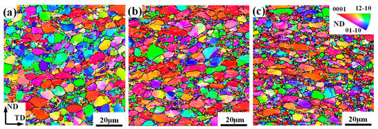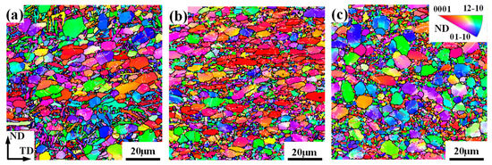 IPF maps of a TA15 alloy under different plane strain deformation temperatures: (a) 800 °C; (b) 850 °C; and (c) 900 °C.