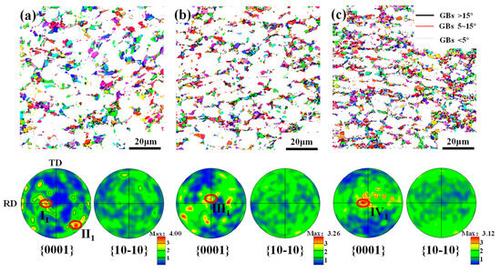 Figure 6a–c gives the orientation characteristics of DRX grains. It can be found that when the deformation amount is small, i.e., 30% and 45%, there are many clustered zones of {0001} poles, and zones I1, Ⅱ1 and Ⅲ1 are similar to those of overall grains. Meanwhile, the distribution of the {10-10} pole is rather scattered. As the deformation amount increases to 60%, although the orientation of DRX grains is dispersed, the clustered zone Ⅳ1 of the {0001} pole is similar to that of the deformed grains. For the TA15 titanium alloy, both discontinuous DRX (DDRX) and continuous DRX (CDRX) can be observed during thermal deformation. As we all know, for DDRX, new grains are formed through nucleation and growth at the expense of the region full of dislocation. While for CDRX, new grains are generated through the progressive transformation of LAGBs to HAGBs. Generally, the orientation of DDRX grains differs from that of deformed grains, whereas the orientation of CDRX grains is close to that of deformed grains. By combining the orientation of overall grains and the DRX grain shown in Figure 4 and Figure 6, and the microstructure features illustrated in Figure 5, it can be inferred that both DDRX and CDRX occur during the plane strain deformation of the TA15 alloy. However, with the increase in deformation, CDRX is gradually more common. The detailed reasons are as follows. Under a small deformation amount, slipping occurs first in the grain with a favorable orientation and it is impeded by GBs when the stored energy is rather high. So, inhomogeneous deformation is conducive to DDRX nuclei and growth. With an increase in deformation, a large number of slip systems are activated and plenty of substructures are generated within the grain. To coordinate plastic deformation, lattice rotation or misorientation accumulation of the substructure occurs, which promotes the prevalence of CDRX. However, the prevalence of CDRX grains still has little influence on the overall texture evolution since there is a similar orientation of the grain to the deformed grain, as shown in Figure 4 and Figure 6.