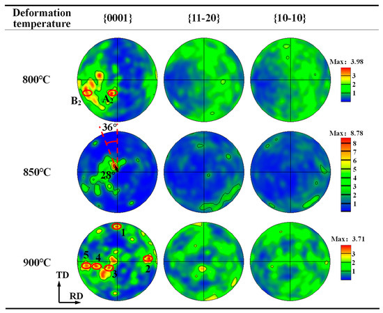 Figure 7 gives the PF of the α phase under various temperatures at a 60% deformation amount and 0.01 s−1 strain rate. As can be seen, when the temperature is 800 °C, each type of pole is dispersive, and some {0001} poles are distributed near the ND, as shown by the region A2 marked in Figure 7, while many {0001} poles are far away from the ND, as shown by the region B2 displayed in this figure. As the temperature rises to 850 °C, the orientation concentration of the α grain is enhanced. In this case, the angle between the C-axis of most grains and the ND can reach 28°, and the angle between the C-axis and the TD is around 36°. The {10-10} and {11-20} poles are located in the RD-TD plane (Figure 7), presenting a non-standard basal texture component. At a temperature of 900 °C, the pole becomes dispersed again, as illustrated in Figure 7. Here, the {0001} pole presents five clustered zones, and the {10-10} and {11-20} poles are almost uniformly distributed in the RD-TD plane, so the texture intensity is low.
