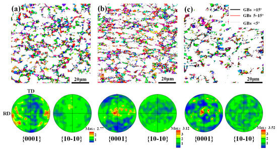 IPF maps of a TA15 alloy under different strain rates: (a) 0.01 s−1; (b) 0.1 s−1; and (c) 1 s−1.