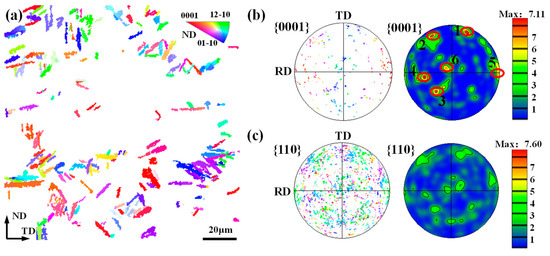 The above orientation features first result from the slip behavior during deformation. For α titanium alloys, basal slip is the dominating deformation mechanism in the two-phase region [23,24,25,26,27,28]. Under a significant compressive deformation state, the activated basal slip can make the C-axis of the α phase gradually deflect towards to the compression axis [7]. Therefore, when the deformation amount is small, partial grains with preferential orientation are first rotated accompanied with basal slipping, thereby causing dispersive poles in this case. When the deformation increases, a large compressive strain along the ND leads to the basal texture forming. However, since the c/a ratio of α-Ti is 1.587, which is less than the 1.633 of the ideal HCP structure, the deformation texture will deviate from the ND slightly [5]. In addition, compared with ordinary unidirectional compression, the strain in the TD is limited under the present strain state, so the {0001} pole will be deflected, and the texture will not be the standard basal texture. Furthermore, the deflection angle between the C-axis and the ND depends on the activation ratio of each slip system and the principal strain ratio in each direction. Generally, in a plane strain compression state, a greater deformation amount causes a higher principal strain ratio, further resulting in a more significant deflection of the basal texture [8]; thus, the deflection degree under 60% deformation amount is obvious.