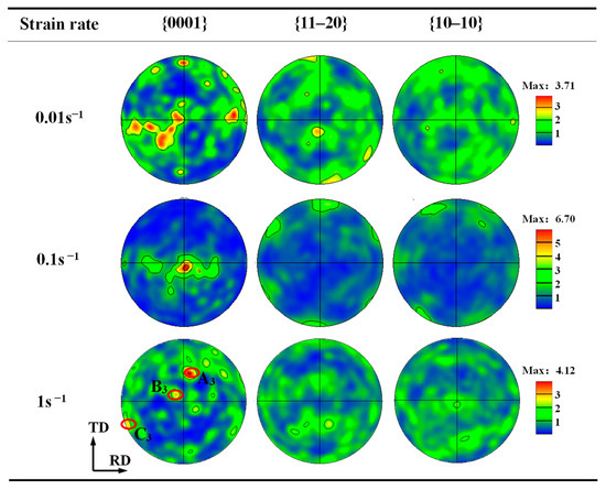 Figure 11 displays the PF of the α phase under various strain rates at a 60% deformation amount and a 900 °C deformation temperature. As we can see, with the strain rate increasing, the poles first gather and then disperse. The basal texture component at a strain rate of 0.1 s−1 is the most obvious and strongest. When the strain rate increases to 1 s−1, the {0001} poles have three distinct clustered regions, A3, B3 and C3, as shown in Figure 11. Here, the C-axis of region B3 has an angle of 38° with the ND and an angle of 11° with the TD. This phenomenon may be because the operation of other slip systems increases with strain rate, except for the basal slip, to coordinate a faster plastic deformation during TMP.