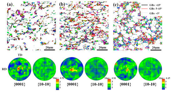 DRX grains and their {0001} and {10-10} PFs of a TA15 alloy under different plane strain deformation temperatures: (a) 800 °C; (b) 850 °C; and (c) 900 °C.