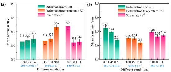 The microhardness distribution of a plane strain-compressed sample is displayed in Figure 14a. As we can see, microhardness can be gradually improved with an increase in the deformation amount and temperature. The average hardness is enhanced by 10 HV as the deformation increases from 30% to 60%, while it is improved by 40 HV as the temperature rises from 800 °C to 900 °C, which means that the deformation temperature has a more significant impact on the mechanical properties than the deformation amount. In terms of the increase in strain rate, the microhardness decreases first and then increases slightly.