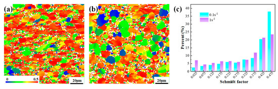 Schmidt factor maps of prism slip when loading along the RD at a strain rate of (a) 0.1 s−1 and (b) 1 s−1; (c) detailed distribution values of Schmidt factor.