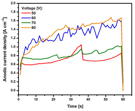 The course of current densities as a function of time for Ti G4 electrodes anodized in a 0.5% AgNO3 solution is shown in Figure 1. It can be observed that as the voltage used in the anodizing process increased, the current density increased. The characteristic trough was not visible on the recorded curves j = f(t), resulting from the formation of oxide nanotubes of the first to third generation due to the presence of fluoride ions in the bath [21]. In the case of a fluoride-free bath, a sharp increase in current density was visible, as in Figure 1. This increase was caused by the fact that the emerging oxide film was produced as a result of the dissolution of oxides, which began at the electrolyte|oxide [22].