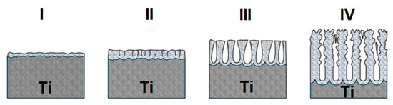 Scheme of anodic production of oxide nanotubes from a fluoride-free bath on the titanium surface: (I)—barrier layer, (II)—increase in the thickness of the barrier layer and the formation of cracks, (III)—formation of a porous structure, (IV)—production of oxide nanotubes.