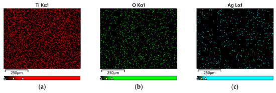 Map of the surface distribution of elements on the Ti G4 surface after anodizing in 0.5% AgNO3 solution at a voltage of 80 V: (a) Ti; (b) O; (c) Ag.