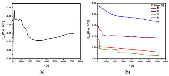 For all tested electrodes, the EOC value changed dynamically in the first 2000 s. Ion-electron equilibrium, manifested by a stable EOC value, was achieved after 7200 s. The EOC for the mechanically polished Ti G4 electrode was −0.381(4) V (Figure 6a). The use of surface modification by anodizing at voltages from 50 to 80 V shifted the EOC value towards positive potentials at which the electrochemical oxidation process was more difficult (Figure 6b). The stable EOC value was between 0.015(3) and 0.168(8) V depending on the anodizing voltage. Such a nature of the EOC = f(t) curves indicated an increase in the corrosion resistance of Ti G4 as a result of the surface modification and improvement of the barrier properties of the oxide layer as a result of its thickening.